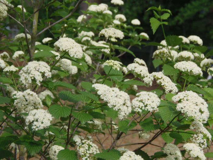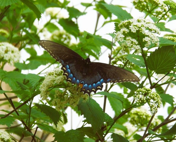 The butterflies and bees are loving and enjoying the viburnum shrub now that it is in full bloom.