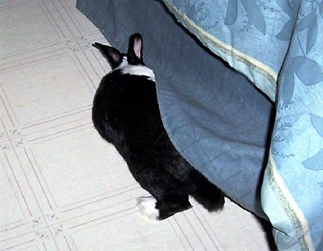 This sweet little bunny found his way to our home. He brought us so much joy. He was a funny little guy and kept us laughing a lot. He got along very well with the other animals, especially one of the cats, they were best friends. He was looking under the bed for his friend. :)